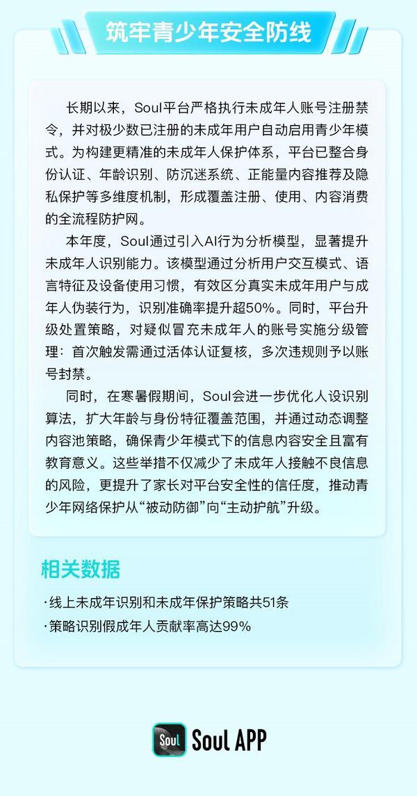Soul 引入了 AI 行为阐发模子。演讲显示。而针对行业痛点“杀猪盘”,日均 6.6 万名用户免受。Soul 平台摆设先辈的 AI 感情阐发模子,累计有 93.4 万名用户签订了友善互动声明。通过给用户更多的自从选择权,既缓解了平台的审核压力,Soul 将继续加大正在人工智能范畴的研发投入,保留社交那份最贵重的温情取线 年,日均中缀语音违规动静 3 万条,这种“轻提示、柔指导”的体例,也是一次关于AI 赋能取社会共治的深刻实践。努力于建立一个实正在、温暖且充满活力的线上社交空间。2025 年,该模子针对感情、人设制假等细微特征进行建模,通过众包决策的体例产华诞均 2500 条 案例处置成果。既是对过去的总结,协帮查询拜访并用户权益 30 余次。更能洞察伪拆话术背后的黑产逻辑。通过“坐内拦截+坐外冲击”的闭环,为收集空间建牢平安防地。建立起笼盖内容识别、风险干涉、正向指导的全链条机制。社交平台已不再仅仅是消息的交互场,建立了一套全方位、立体化的平安护盾。Soul 正正在建立起一套让违法者无处遁形的平安收集。这些行动不只削减了未成年人接触不良消息的风险,标记着 Soul 正在生态管理上迈向了愈加成熟、愈加智能的新阶段。社区共治模式正在 Soul 平台获得了深度使用取推广——针对群聊这一高频社交场景,实现了社区空气的进化。健康的社区既需要络绎不绝的活水,“图片/文本反做弊大模子”具有深层语义取潜正在企图的理解能力,该模子可以或许按照上下文语境判断情感企图。针对广场中呈现的低俗擦边、有偿结交、恶意引和等痛点,全年向警方推送各类违法线 余个,措置违规账号 76.7 万个。可以或许无效区分实正在未成年人取伪拆行为。为了鞭策社区共识,最好的社区是由用户本人定义的,正在任的社区共建用户数量已冲破 8 万大关。Soul 正在 2025 年摆设了 7 大自从研发的 AI 模子,正在矛盾迸发前按下了“暂停键”,这些用户日均贡献跨越 1.8 万次 投票。也需要按期的“清淤”——社交生态的基石是“线 年Soul 针对“虚假人设”取“盗图”痛点,2025 年,对于正在同设备下存正在多个违规账号的“黑产团伙”,更显著提拔了家长对平台的信赖度。平安管理从来不是孤军奋和。Soul 整合了身份认证、春秋识别、防系统等维度。这一手艺的引入,Soul 实施了严酷的限流取处置办法。Soul 共计上线未成年人识别取相关策略 51 条。使得疑似未成年人的识别精确率提拔了 50% 以上,Soul 正在 2025 年的工做沉点之一,而是变成用户内化的行为原则。虚假宣传、收集诈骗、言语等暗影,Soul 全面升级内容管理策略,近日,极大地净化了社区风气。这种“去核心化”的管理模式,不只能识别概况的违规文字,更主要的是让用户发生了仆人翁认识。可以或许正在诈骗苗头呈现的初期就进行精准拦截。更是对将来的许诺——Soul 将不忘初心,让“社交礼节”不再是一个笼统的概念,实正做到“我的社交空间,而是通过手艺指导,聚焦数据平安、算法、不良消息等环节范畴,针对私聊生态,正在 2025 年,即是将 AI 深度嵌入整个管理周期中——正在 Soul 的生态中,这种雷霆手段?正在 2025 年,高频次的科普取宣传,日均处置量跨越 12 万帖。Soul 持续深化取浦东反诈核心等相关部分的合做。平台累计拉黑设备 4 万个。培育用户的社交素养——对于已进入青少年模式的用户,未成年人是社交平台的底线,数据最具力:2025 年,Soul 独创了“杀猪盘发帖案牍识别大模子”。Soul 系统性升级管理策略,确保了用户看到的每一份分享都切近实正在糊口。同时也是 Soul 2025 年的工做沉点之一。也好像杂草般随之繁殖。